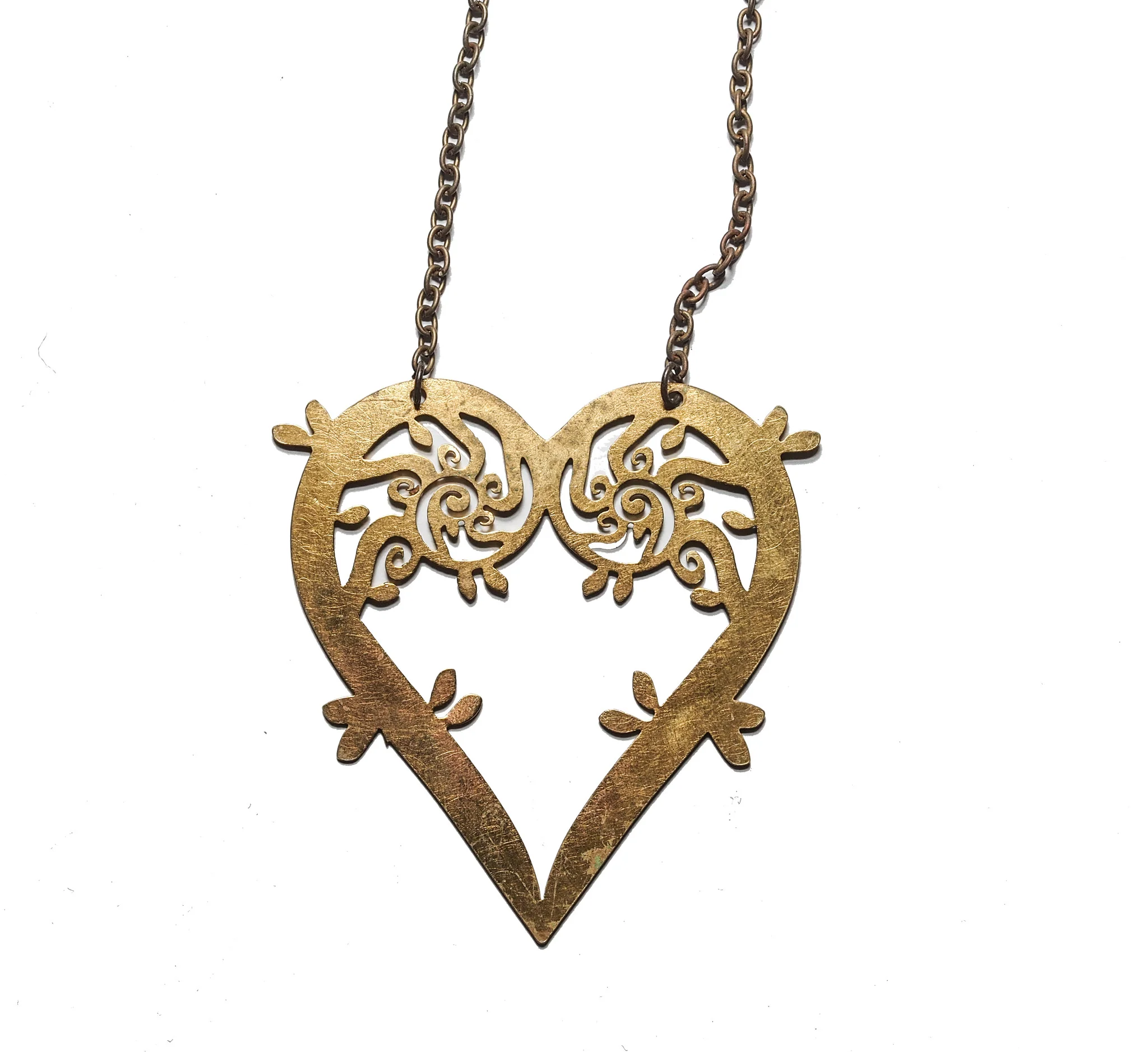 This charming solid brass fiddlehead fern curves into a faerie-friendly heart. The fiddlehead measures 2 3/4 inches long and 2 inches wide and hangs from an 18" chain.