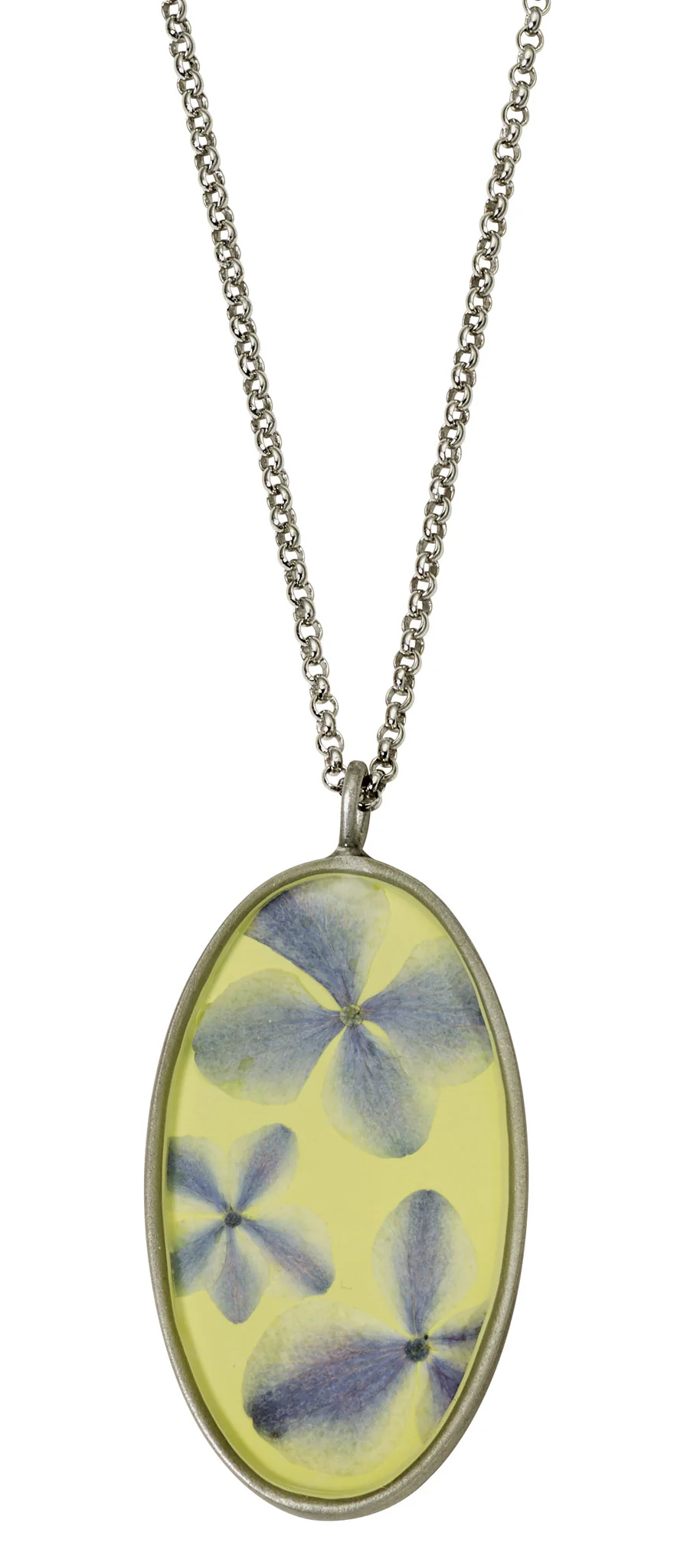 Genuine Pressed Hydrangea resin-set in bezel pendant.