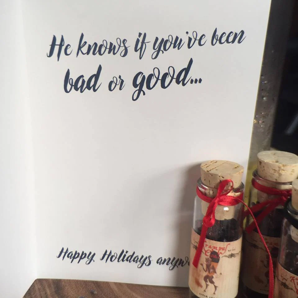 Message inside: "He knows if you've been good or bad.... Happy Holidays anyway!"